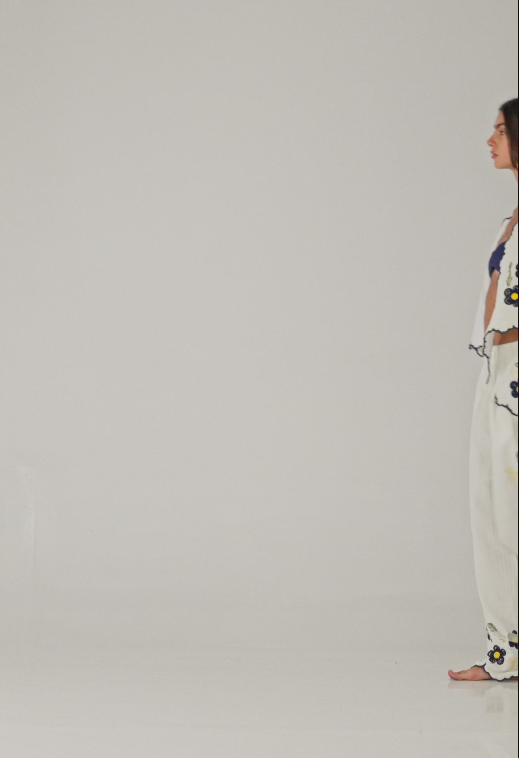 El pantalón de invierno presenta un corte holgado de pierna ancha con cintura elástica para mayor comodidad durante todo el día. Con detalles de bordado floral a máquina, ribete festoneado y prácticos bolsillos laterales, está diseñado para usarse solo o combinado con la camisa Soleil para un look coordinado.